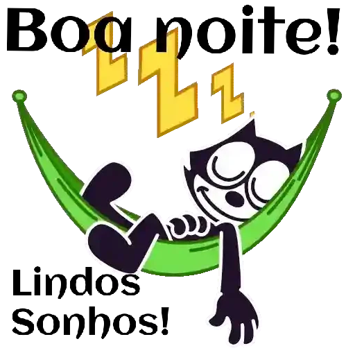 Un gato de dibujos animados relajado en una hamaca verde, con las frases 'Boa noite!' y 'Lindos Sonhos!' y tres Zs dorados de sueño.
