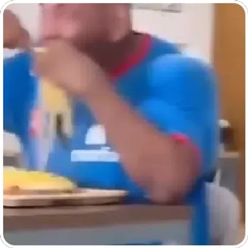 Hombre comiendo una banana sentado en una mesa, con una camisa azul con puños rojos.