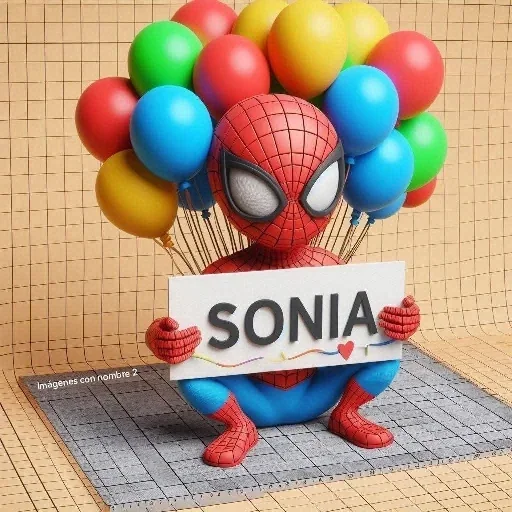 El hombre araña sosteniendo una tarjeta con el nombre 'SONIA' y globos de colores.