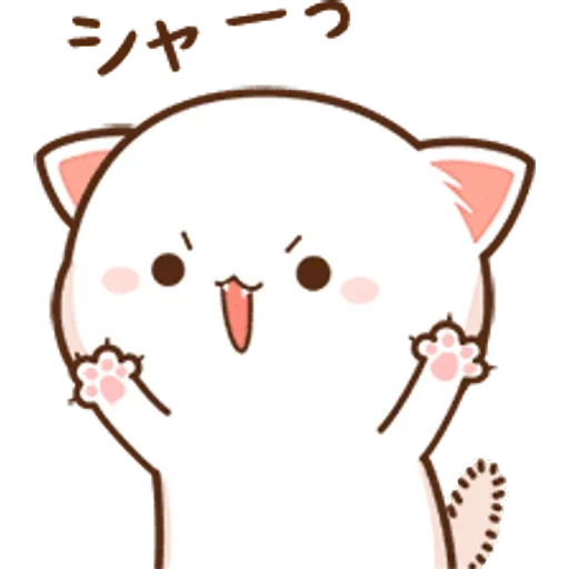 Gatito lindo con patas levantadas y lengua fuera, orejas rosadas y texto en japonés arriba. El gato tiene ojos marrones y mejillas rosadas.