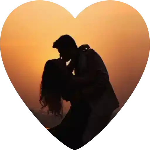 Una pareja besándose en silueta contra un atardecer, dentro de un corazón naranja.