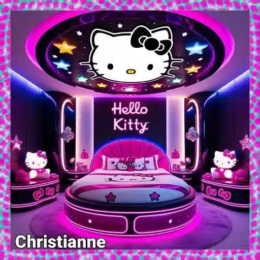 Quarto rosa com cama e decoração da Hello Kitty, cortinas e parede rosa, com o nome 'Christianne' no canto.