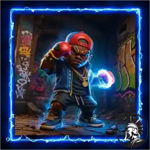 Un personaje de anime con piel oscura, usando una gorra roja, chaqueta azul y cadenas de oro, en una pose dinámica con una luz azul saliendo de su mano en un escenario urbano con grafitis.