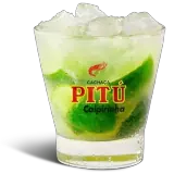 Um copo de caipirinha com limão e gelo, com o logotipo da Pitu Caipirinha.