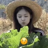 Uma mulher asiática com chapéu de palha olha para uma planta de alface com uma expressão facial de desaprovação ou…