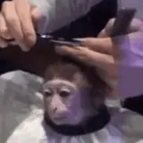 Um macaco sentado em uma cadeira de barbeiro, recebendo um corte de cabelo de alguém. O macaco parece surpreso ou…