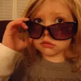 Uma menina loira com óculos de sol rosa está com a mão no rosto, parecendo preocupada ou confusa.