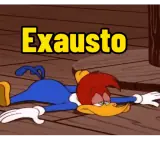 Um personagem de desenho animado, provavelmente o Woody Woodpecker, deitado de costas no chão com expressão de…