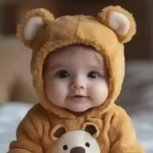 Um bebê com uma expressão séria vestindo um macacão de urso cor de mel, com capuz e orelhas de urso. O bebê segura um ursinho de pelúcia branco.