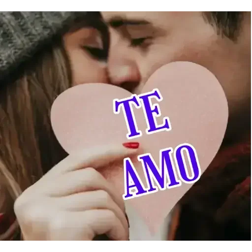 Um casal se beijando, com a mulher segurando um coração rosa com as palavras 'TE AMO' em letras roxas.