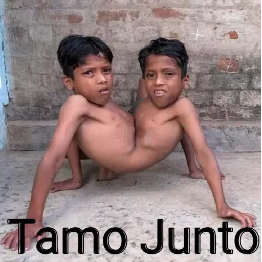 Dois meninos siameses, sem camisa e descalços, fazendo flexão com os braços apoiados no chão. A imagem mostra os meninos unidos pelo tórax, com uma expressão facial surpresa. 'Tamo Junto' está escrito em preto na parte inferior.
