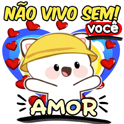 Um ursinho branco usando um capacete amarelo, com um coração azul e vermelho ao fundo. O texto 'NÃO VIVO SEM!' e 'AMOR' e 'você' aparecem na imagem.
