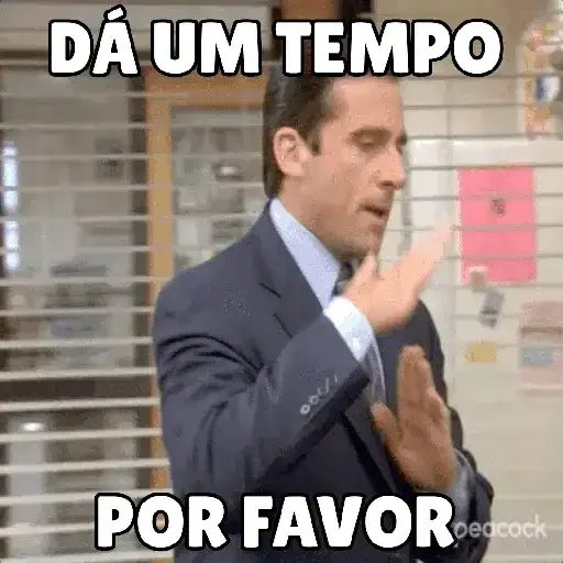 Um homem de terno fazendo um gesto com as mãos e a expressão facial séria, com o texto 'DÁ UM TEMPO POR FAVOR' em letras brancas com contorno preto.