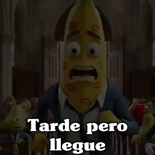 Um banana antropomórfico com expressão de surpresa ou choque, vestindo um blazer e gravata. Abaixo dele, está escrito 'Tarde pero llegué'.