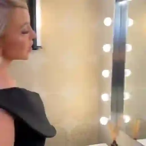 Mulher loira vestida de preto olhando um espelho com luzes ao redor.
