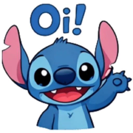 Stitch, personagem de Lilo & Stitch, sorri e acena com a mão direita, com a palavra 'Oi!' em azul acima de sua cabeça.