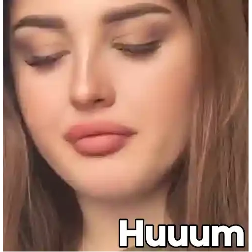Rosto de uma mulher com os olhos fechados e uma expressão neutra, lábios levemente pintados, cabelo castanho. A palavra 'Huuum' aparece no canto inferior direito.