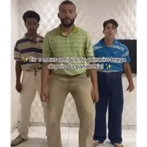 Três homens de diferentes idades e etnias posam lado a lado, com um texto sobreposto que parece ser uma legenda ou diálogo. O homem do meio usa uma camisa verde, enquanto os outros dois usam roupas diferentes.