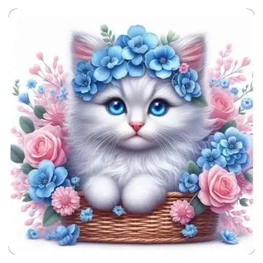Gatinho branco com olhos azuis e uma coroa de flores azuis, sentado em uma cesta de vime rodeada de flores rosadas e azuis.