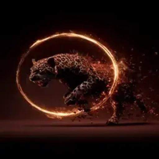 Um tigre preto em movimento, com partes do corpo se desintegrando em pedaços vermelhos, em um fundo escuro com luz…