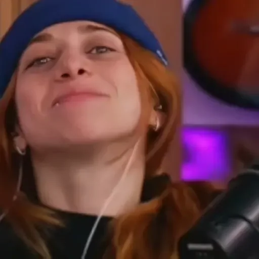 Uma jovem mulher com cabelos castanhos e um gorro azul olha para cima com uma expressão pensativa, usando fones de ouvido.
