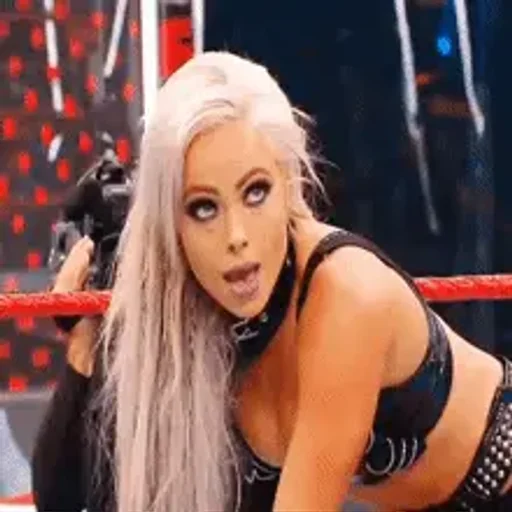Mulher loira com expressão surpresa, usando um top preto e pulseira, em um ringue de luta com corda vermelha.