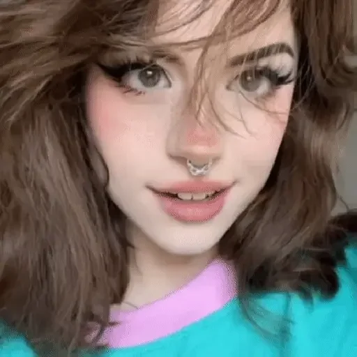 Rosto de uma jovem mulher com cabelo castanho, olhos claros e um septo no nariz, usando um suéter azul com gola rosa.