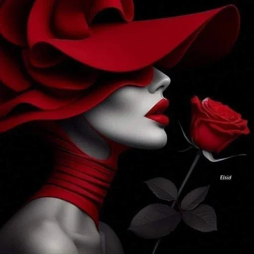 Mulher de pele clara com chapéu vermelho e roupa vermelha, olhando um rosa vermelha.