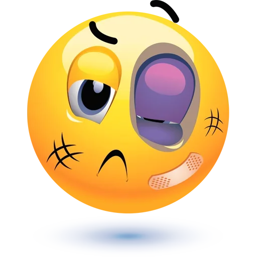Rosto de emoji amarelo com expressão de dor ou desconforto, um olho roxo e um curativo na bochecha.