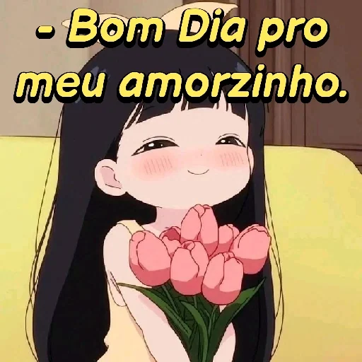 Uma garota de anime com cabelos pretos e rosados nas bochechas segura um buquê de tulipas cor-de-rosa e diz 'Bom Dia pro meu amorzinho.'