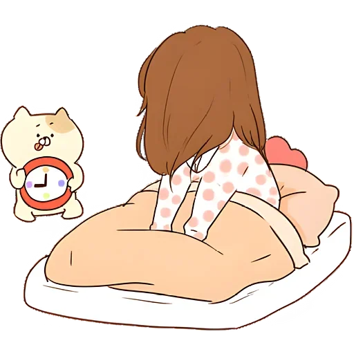 Uma menina de cabelos castanhos está deitada na cama com um cobertor rosa, enquanto um gato de pelagem clara segura um relógio de despertador vermelho.