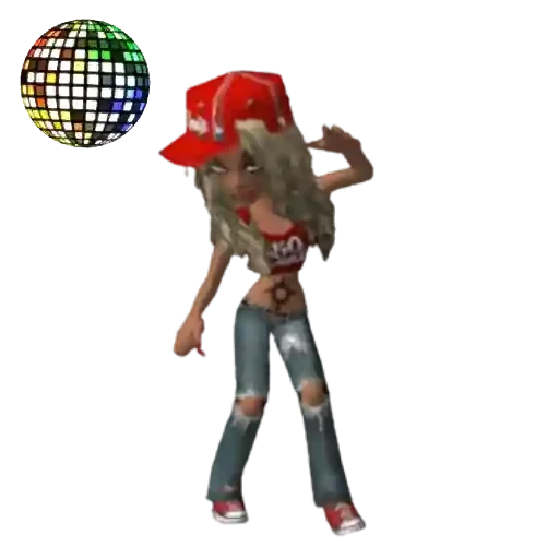 Uma mulher de cabelo castanho com um chapéu vermelho e calça jeans dançando perto de uma bola espelhada.