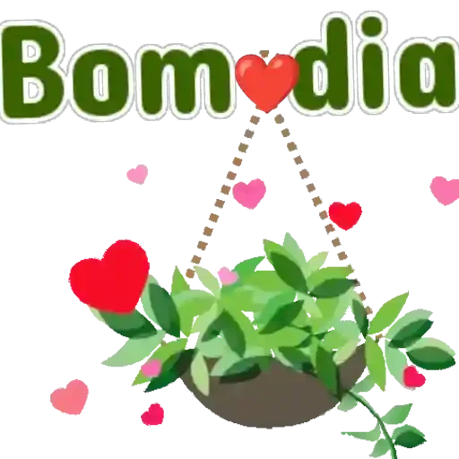 Uma planta em um vaso com folhas verdes e corações vermelhos e rosa, com a frase 'Bom dia' em letras verdes.