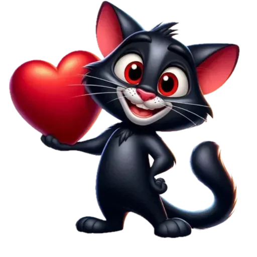 Gato preto com olhos vermelhos e orelhas rosadas segurando um coração vermelho.