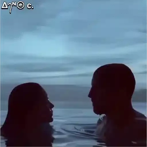 Um casal de perfis siluetados se olhando em uma água, com o céu nublado ao fundo. Há um símbolo no canto superior esquerdo.