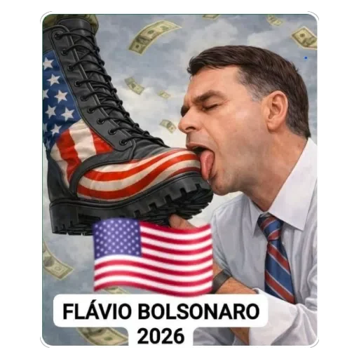 Um homem com um terno e gravata beijando um sapato com a bandeira dos EUA enquanto notas de dinheiro caem ao fundo. O texto 'FLÁVIO BOLSONARO 2026' aparece na parte inferior.