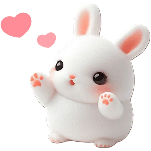 Um coelho branco fofo com olhos grandes e orelhas rosadas, com patas levantadas e corações rosas ao lado.