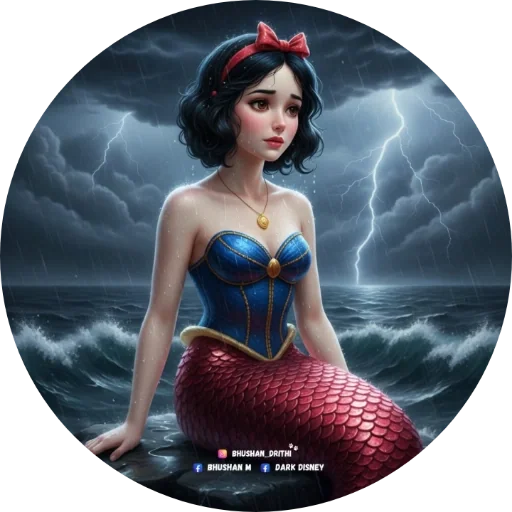 Uma mulher com busto de Snow White vestindo um sutiã azul e uma cauda de peixe vermelha, com um laço vermelho no cabelo, sentada em frente a um mar agitado com raios e nuvens escuras.