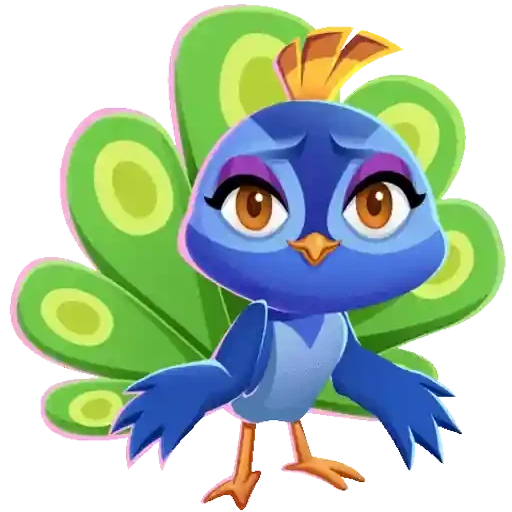 Um pássaro azul cartoon com penas verdes atrás, olhos castanhos e expressão facial fofa.