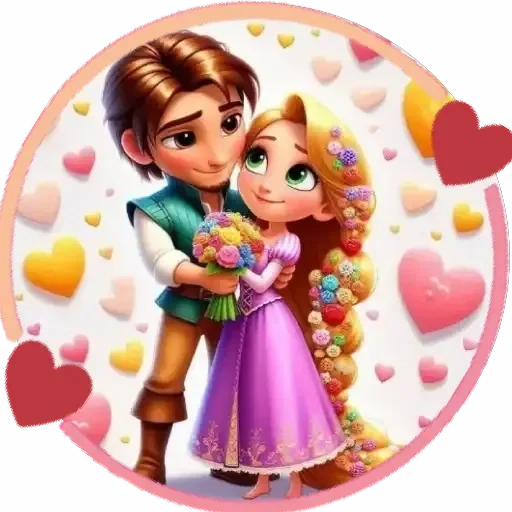 Um casal de personagens de desenho animado, um rapaz com cabelos castanhos e uma moça com cabelos loiros longos, se abraçando com flores e corações coloridos ao fundo.