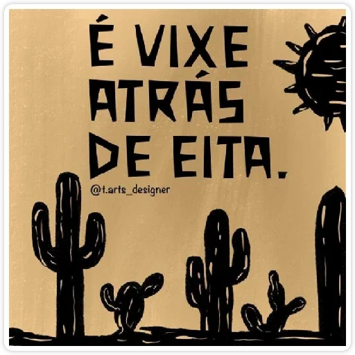 Uma ilustração de cactos em um cenário desértico com o sol ao fundo e o texto 'É VIXE ATRÁS DE EITA.' em letras grandes e pretas.