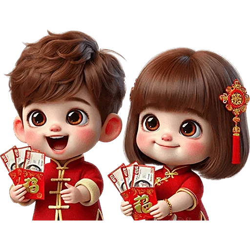 Dois personagens infantis fofos, um menino e uma menina, vestidos com roupas vermelhas e douradas, segurando dinheiro…