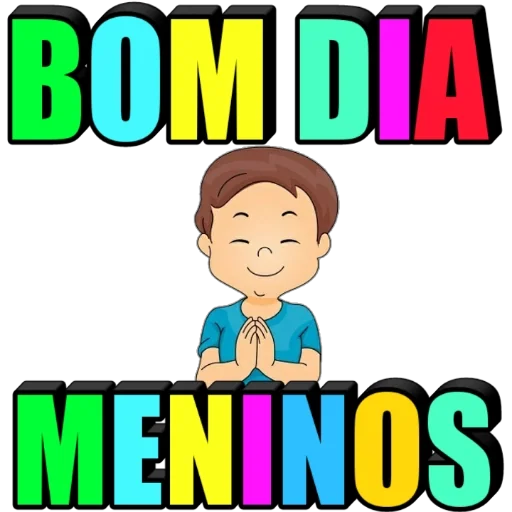 Menino de mãos juntas com olhos fechados e sorriso, vestindo uma camisa azul, com as palavras 'BOM DIA MENINOS' em letras grandes e coloridas.