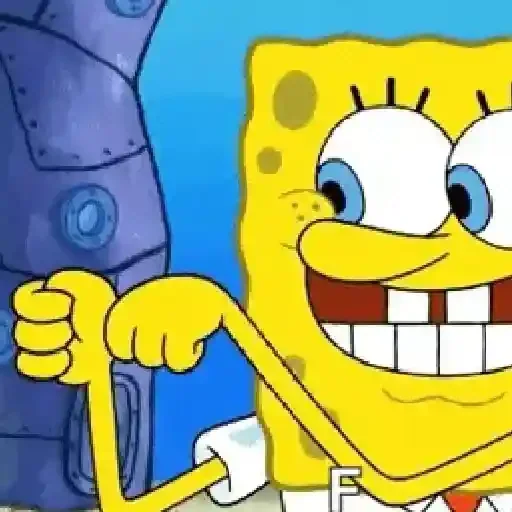 EspongeBob sorrindo e fazendo um gesto com a mão, com um fundo azul e uma estrutura roxa ao lado.