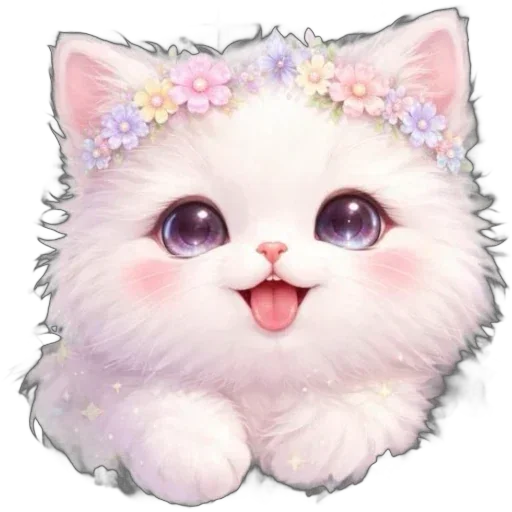 Gatinho branco fofo com flores na cabeça, olhos grandes e língua para fora. O gato tem bochechas rosadas e um focinho rosa.