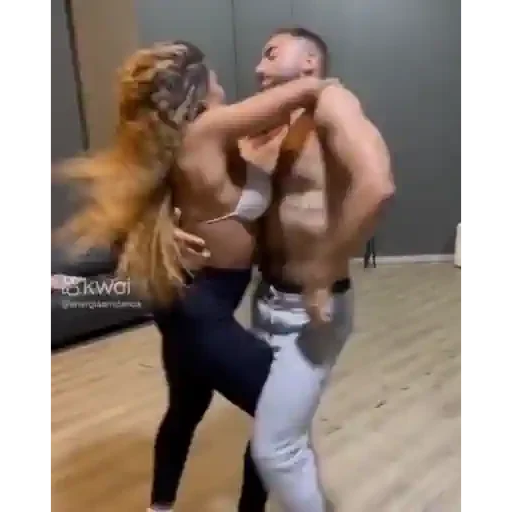 Uma mulher com cabelo loiro e legging preto beijando um homem de torso nu e calça cinza.