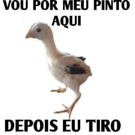 Um pintinho branco com manchas pretas nas asas e pernas amarelas, com o texto 'VOU POR MEU PINTO AQUI DEPOIS EU TIRO' em letras pretas.