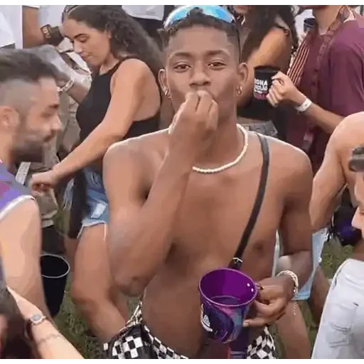Homem sem camisa, com óculos de sol na cabeça, correndo, com uma pulseira e um colar, segurando um copo roxo em uma mão e com a outra mão perto da boca.