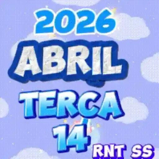 Uma figurinha com texto em um fundo roxo com nuvens brancas. O texto é '2026 ABRIL TERÇA 14 RNT SS' em cores azul e branco.