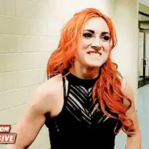 Mulher com cabelo laranja e vestido preto, parecendo uma lutadora, em um corredor com parede de tijolos.